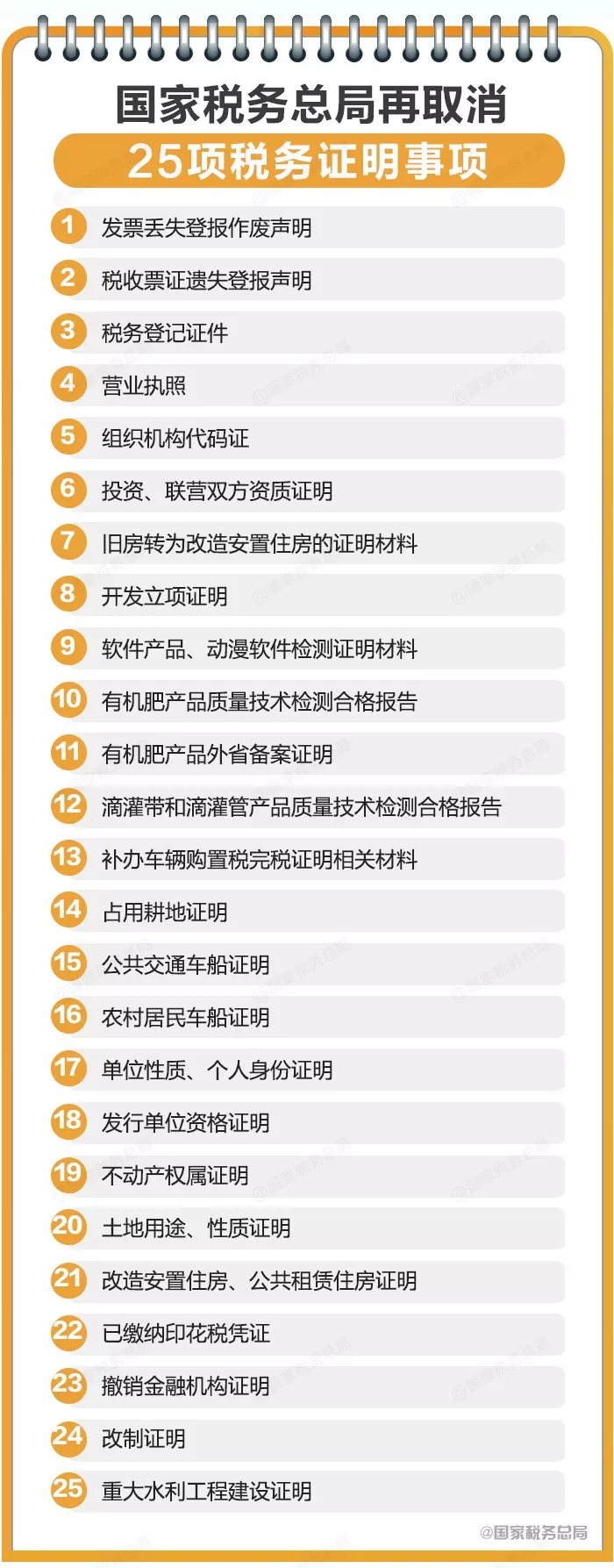 (一)公布取消25项税务证明事项