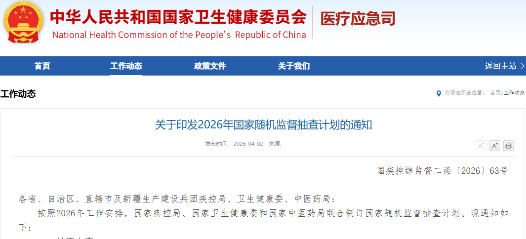 按照2026年工作安排,国家疾控局、国家卫生健康委和国家中医药局联合制订国家随机监督抽查计划。现通知如下: