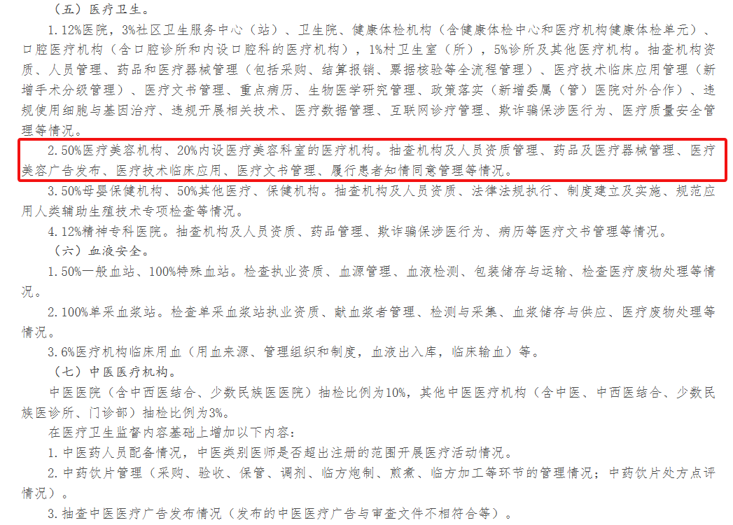 2.50%医疗美容机构、20%内设医疗美容科室的医疗机构。抽查机构及人员资质管理、药品及医疗器械管理、医疗美容广告发布、医疗技术临床应用、医疗文书管理、履行患者知情同意管理等情况。