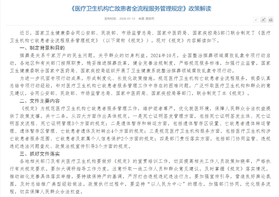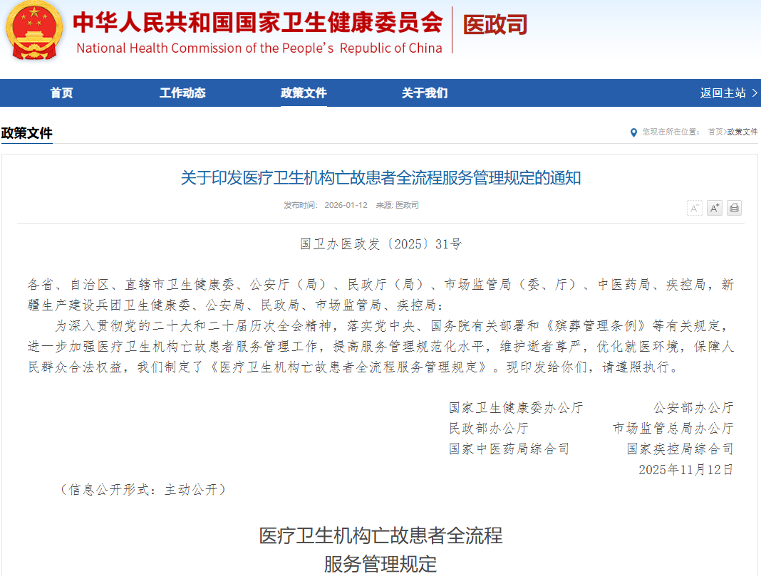 关于印发医疗卫生机构亡故患者全流程服务管理规定的通知