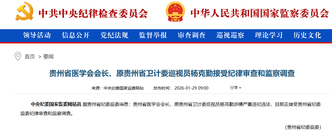 2026年1月29日,一则来自贵州省纪委监委的通报在医疗系统和纪检监察领域引起震动。通报指出,贵州省医学会会长、原贵州省卫计委巡视员杨克勤涉嫌严重违纪违法。