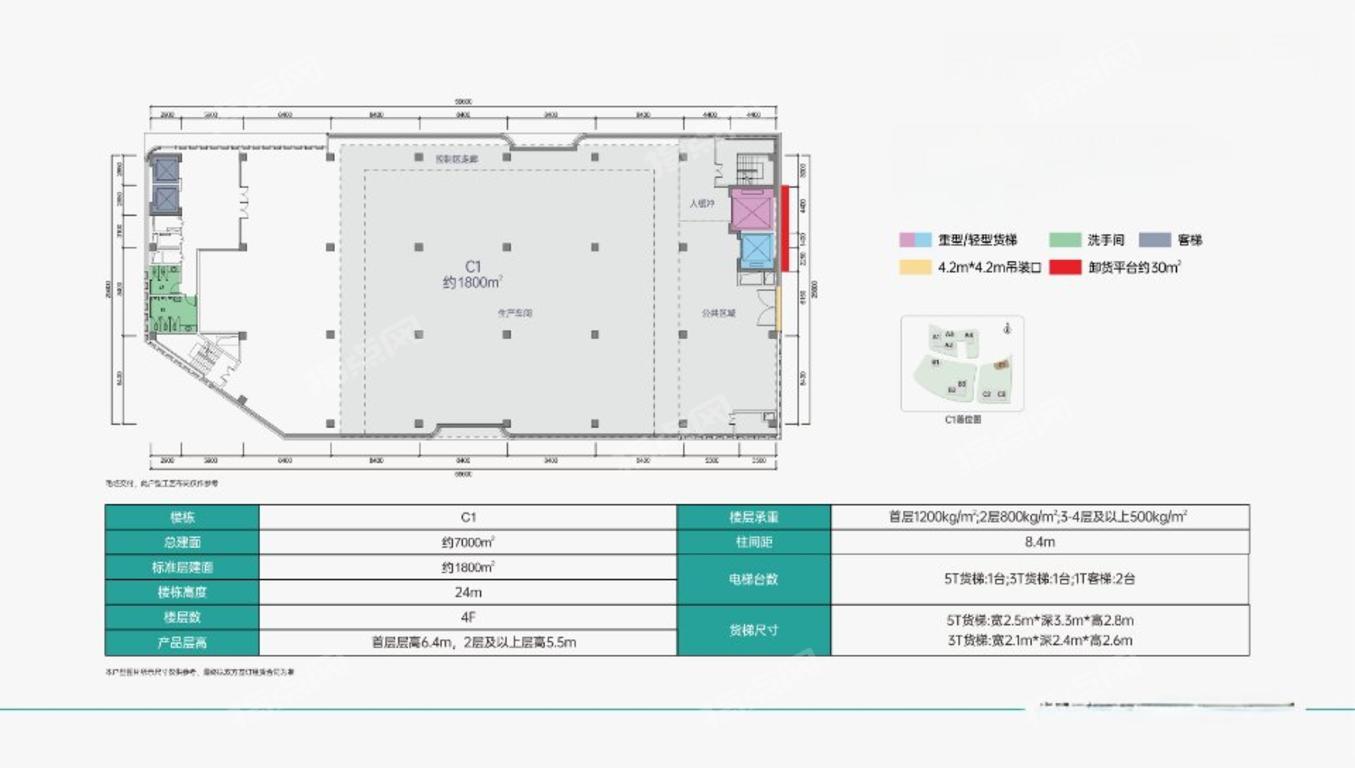 整栋总建面 约7000㎡; 标准层建面 约1800㎡; 楼 栋 高 度 24m; 楼 层 数 4F; 层 高 参 数 首层6.4m 丨 2层及以上5.5m; 承 重 参 数  首层1200KG/㎡ 丨 2层800KG/㎡ 丨 3-4层500KG/㎡; 柱 间 距 8.4m; 电 梯 2台1T客梯,1台3T货梯,1台5T货梯; 货 梯 尺 寸  5T(宽2.5m*深3.3m*高2.8m); 3T(宽2.1m*深2.4m*高2.6m); 吊 装 口 4.2m*4.2m(带卸货平台,位置见下图红色区域);